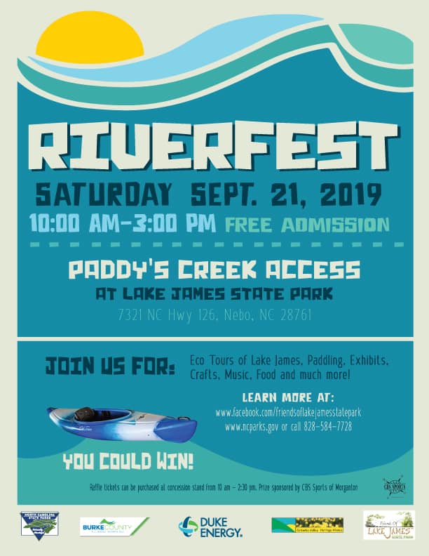 Attendees will be able to demo kayaks, canoes, and paddleboards free of charge. An all-day raffle will be held with prizes including t-shirts, a 9’ kayak package and more. Raffle tickets will be available for purchase at the Lake James concession stand prior to the event and on site the day of the event. Visitors will also be able to participate in free educational programs throughout the day. Events will include eco-tours led by park rangers,craft tables set up for take-home kid’s crafts, live music will be provided by Slight Departure.