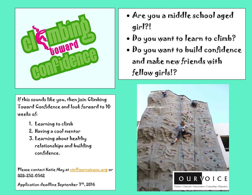 Sept 12th – Climbing Toward Confidence Empowerment Program for Middle School Aged Girls with Our VOICE. “Aimed at building confidence, improving assertive communication skills, and ultimately reducing the risk of sexual violence for adolescent girls, this 10-week after school program pairs discussions and workshops on gender, stereotypes, dating safety and communication with rock climbing at an indoor facility. To learn more and register, contact Katie May at ctc@ourvoicenc.org or by phone at 252-0562 ext. 111.