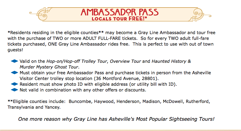 Daily, Monday-Sunday 9:00am-5:00pm – Be an Ambassador! Locals Tour FREE on Gray Line Trolley Tours of Asheville with the purchase of TWO or more ADULT full-fare tickets. One Gray Line Ambassador Pass for every two adult full-fare tickets purchased. Valid on the Hop-on/Hop-off Trolley Tour, Overview Tour and Haunted History & Murder Mystery Ghost Tour.”