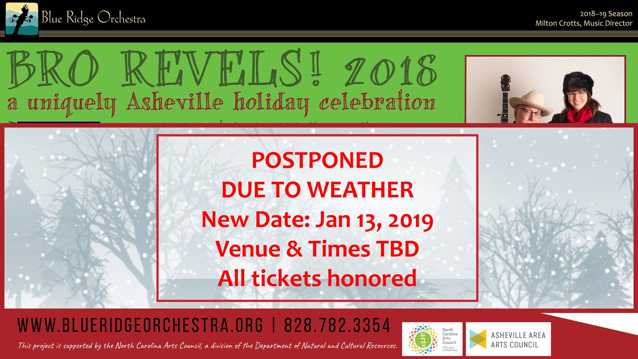 Due to Winter Storm Diego, aka The Carolina Crusher, the BRO Revels Concerts originally scheduled for Sunday, December 9 are being rescheduled for Sunday, January 13, at a time and venue to be announced. All tickets issued for the December 9 concerts will be honored on January 13. Information about times and venues will be available here and on www.blueridgeorchestra.org once it becomes available. If you have questions, please contact the BRO during regular business hours at 828.782.3354. Stay warm!!