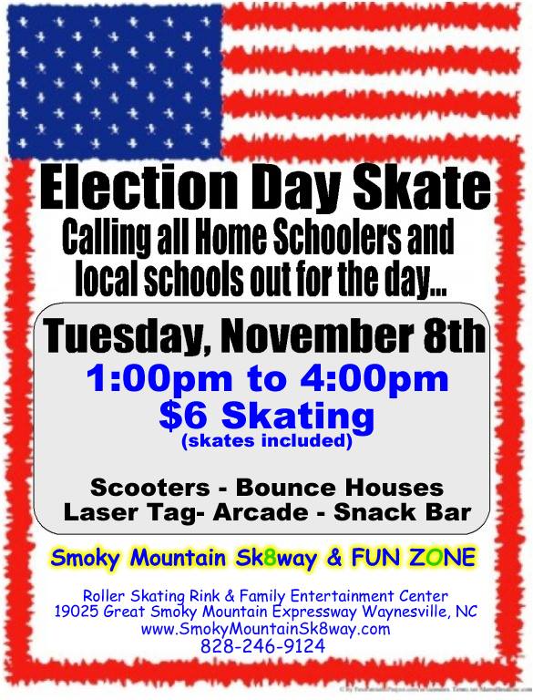 Election Day Skate Calendar Add to Calendar Add to Timely Calendar Add to Google Add to Outlook Add to Apple Calendar Add to other calendar Export to XML When: November 8, 2016 @ 1:00 pm – 4:00 pm 2016-11-08T13:00:00-05:00 2016-11-08T16:00:00-05:00 Where: Smoky Mountain Sk8way & FUN ZONE 19025 Great Smoky Mountains Expy Waynesville, NC 28786 USA Cost: Free Contact: Smoky Mountain Sk8way & FUN ZONE 828-246-9124 Event website Special Event Fitness skating Smoky Mountain Sk8way Waynesville Julie Carter November 7, 2016 25 No Comments