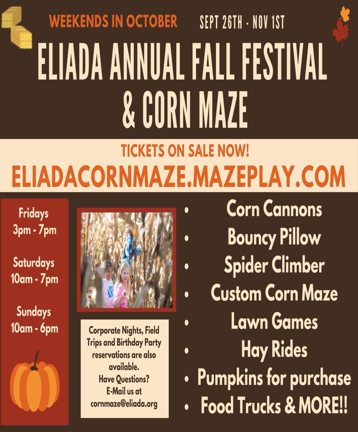Annual Eliada Corn Maze and Fall Festival! WNC’s ONLY non-profit Corn Maze with 100% of the proceeds benefiting the children at Eliada! Not only does your ticket purchase come with access to family-friendly fun, memories, and adventures, but it directly aids in the growth and success of Eliada’s kids! Attractions will include corn cannons, bouncy pillow, a spider climber, a custom corn maze, lawn games, hay rides, pumpkins for purchase, food trucks, and MORE!