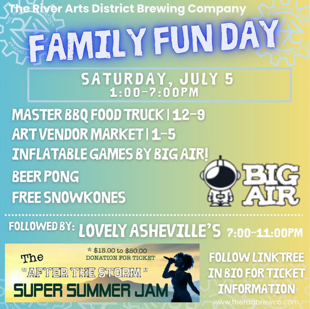 • 🎶 Then we keep the party rolling with Lovely Asheville’s After the Storm Super Summer Jam from 7–11PM!