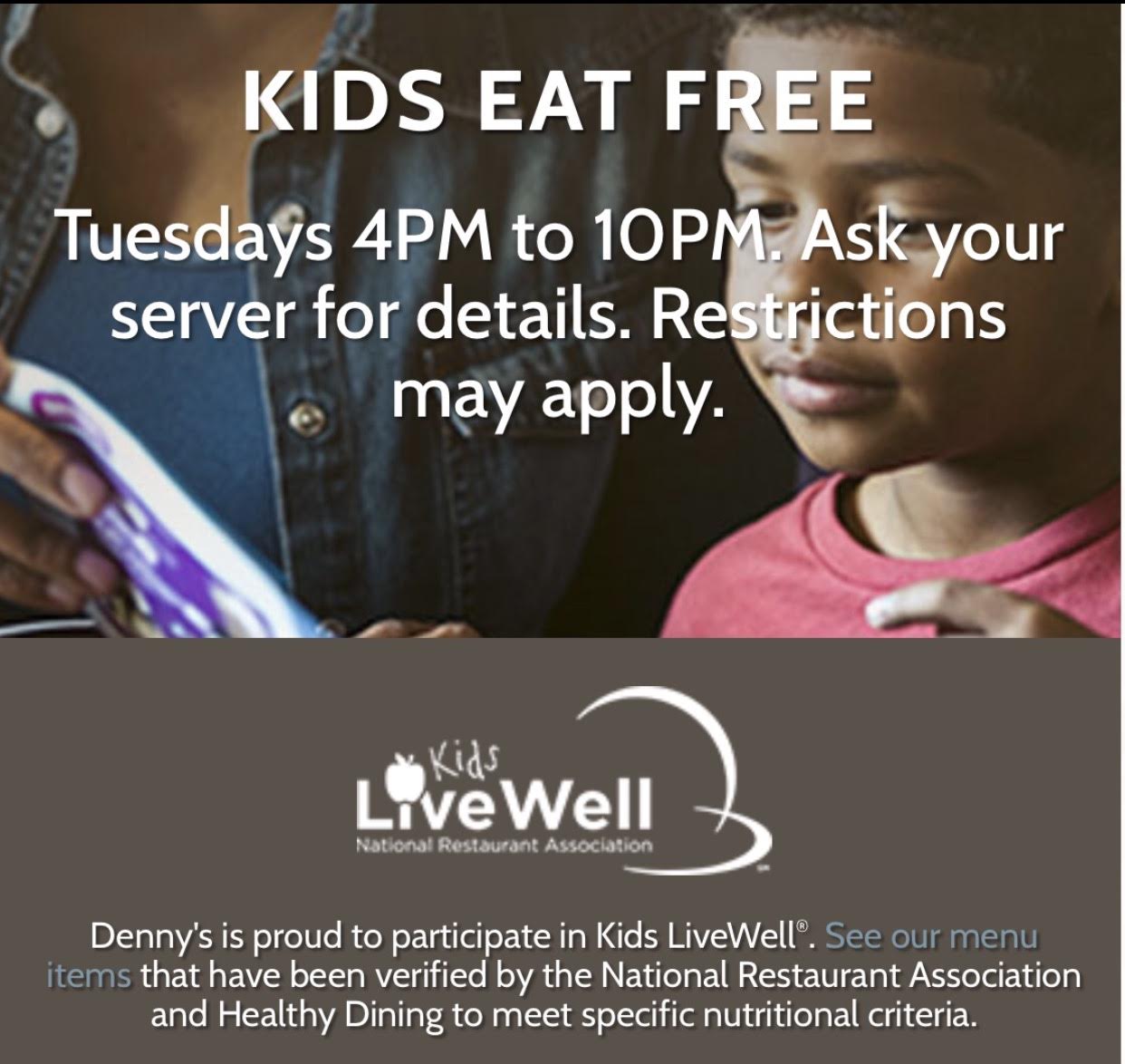 Kids Eat FREE Calendar Add to Calendar Add to Timely Calendar Add to Google Add to Outlook Add to Apple Calendar Add to other calendar Export to XML When: October 4, 2016 @ 4:00 pm – 10:00 pm 2016-10-04T16:00:00-04:00 2016-10-04T22:00:00-04:00 Where: All Area Denny's Restaurants Contact: Denny's Restaurants Event website Kids Eat FREE/Cheap Denny's food Kids Eat Free Tuesdays, 4pm-10:00pm See your server for details. Some restrictions may apply. Julie Carter September 4, 2016 49 No Comments