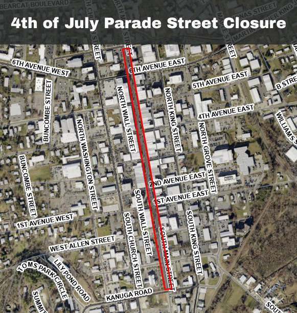 Once the parade concludes, Main Street from Caswell to 3rd Avenue will remain closed as we prepare for the 4th of July celebration and concerts starting at 5:00 PM.