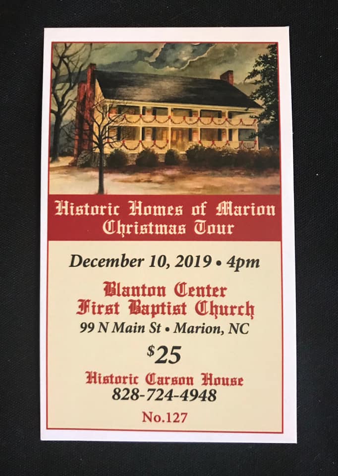 Historic Homes of Marion Christmas Tour Calendar Add to Calendar Add to Timely Calendar Add to Google Add to Outlook Add to Apple Calendar Add to other calendar Export to XML When: December 10, 2019 @ 4:00 pm – 6:00 pm 2019-12-10T16:00:00-05:00 2019-12-10T18:00:00-05:00 Where: Blanton Center First Baptist Church 99 North Main Street Marion NC Contact: Historic Carson House (828) 724-4948 Event website Special Event christmas Historic Carson House holiday tour This Christmas tour will be spectacular. Contact the Historic Carson House at 828-724-4948. Julie Carter November 15, 2019 37 No Comments