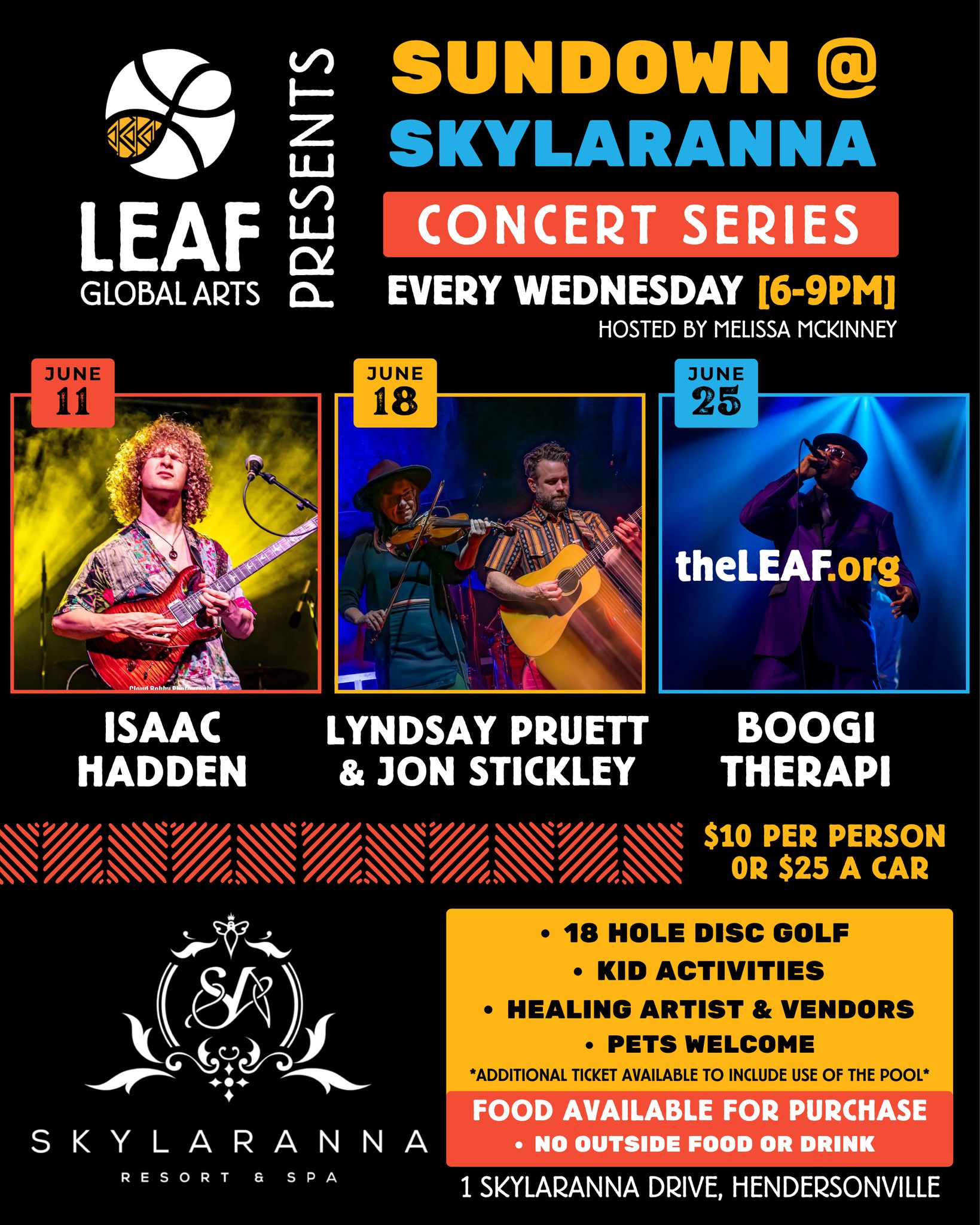 LEAF Global Arts presents Sundown @ Skylaranna, a Concert Series that benefits artists impacted by Hurricane Helene.