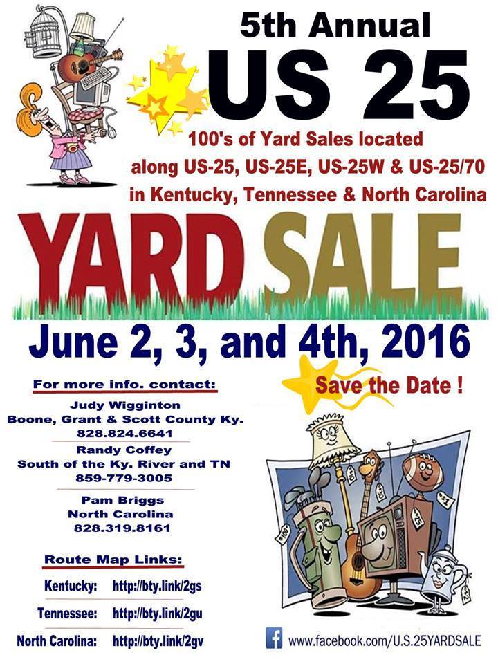 If you live on US 25 or own property on that route, you have an opportunity to use your property to make extra money….for your own yard sale or to rent your spaces to vendors.
