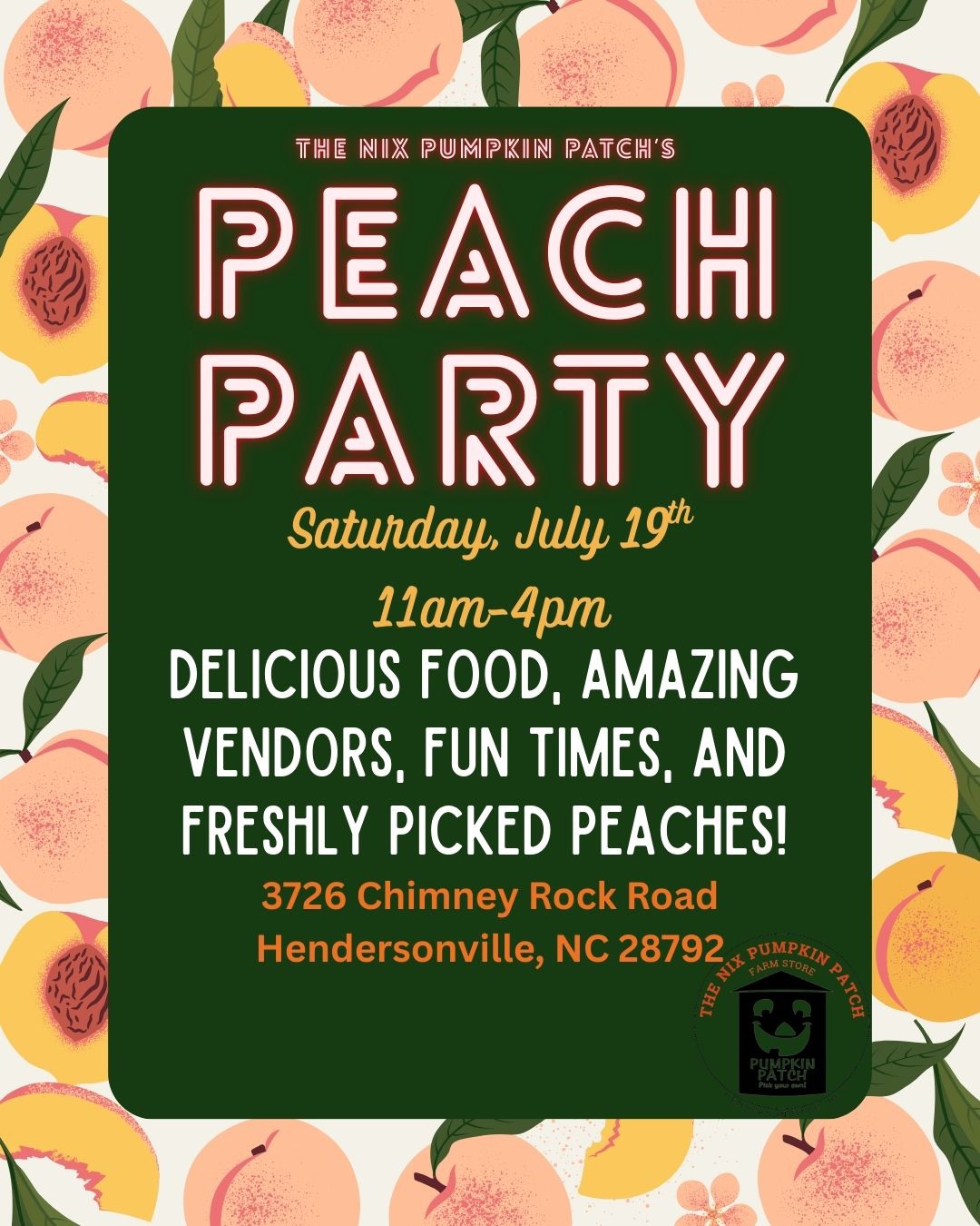 Come join us for our first annual PEACH PARTY! Delicious food, amazing, vendors, fun times, and freshly picked peaches!