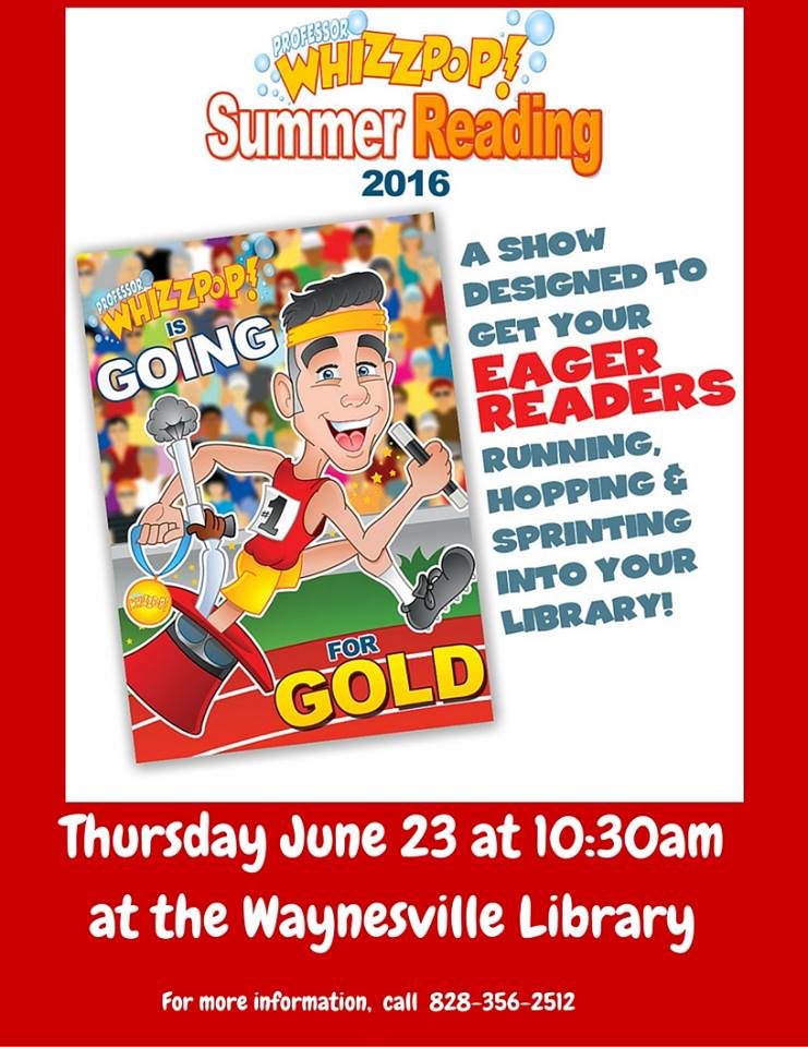 Professor Whizzpop is Going for the Gold! Calendar Add to Calendar Add to Timely Calendar Add to Google Add to Outlook Add to Apple Calendar Add to other calendar Export to XML When: June 23, 2016 @ 10:30 am – 11:30 am 2016-06-23T10:30:00-04:00 2016-06-23T11:30:00-04:00 Where: Waynesville Public Library 678 S Haywood St Waynesville, NC 28786 USA Cost: Free Contact: Haywood County Public Library (828) 452-5169 Event website Special Event Haywood County Library Library Magic Professor Whizzpop Waynesville Waynesville Public Library A show designed to get your eager readers running, hopping, and sprinting into your library! Julie Carter June 16, 2016 25 No Comments