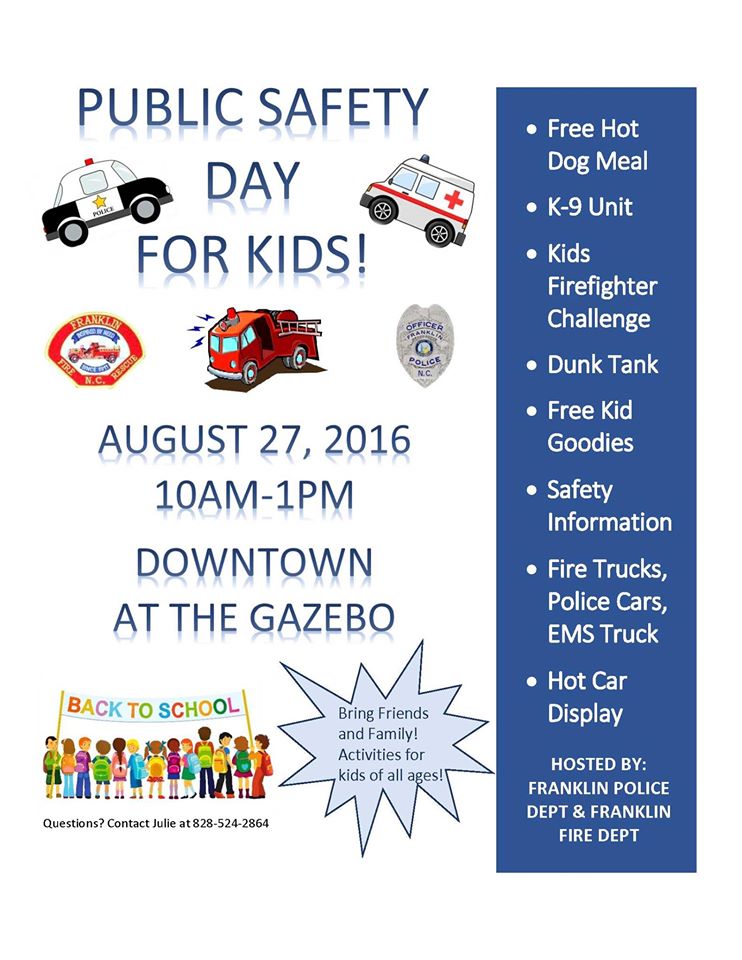 Come out downtown by the Gazebo for kid friendly fun and goodies. Bring family, friends and all kids are welcome! Free hot dog meal, dunk tank, fire trucks, K-9 Unit and lots more fun to be had. Drop by to see the public safety organizations of Macon County come together to promote school safety and fun. Get to know the individuals in our community keeping us safe and protected. This event is hosted by the Franklin Police Department and Franklin Fire Department with participation from Macon County Sheriffs Office, Macon County EMS, Highlands Police Department.