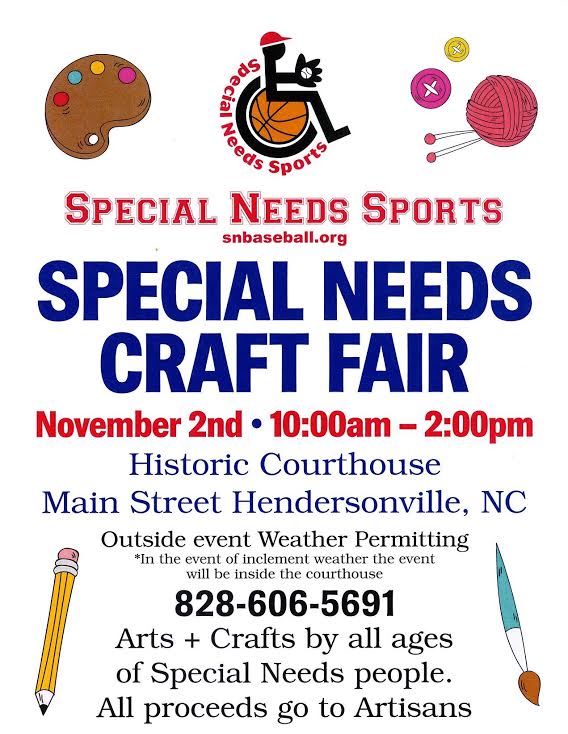 Special Needs Craft Fair Calendar Add to Calendar Add to Timely Calendar Add to Google Add to Outlook Add to Apple Calendar Add to other calendar Export to XML When: November 2, 2019 @ 10:00 am – 2:00 pm 2019-11-02T10:00:00-04:00 2019-11-02T14:00:00-04:00 Where: Historic Hendersonville Courthouse Main Street Hendersonville NC Contact: Special Needs Baseball (828) 606-5691 Event website Fair Special Event Autism craft fair craft market fall fun Fundraiser Henderson County Courthouse Hendersonville Special Needs Arts + crafts by all ages of special needs people. All proceeds go to Artisans. Julie Carter October 19, 2019 40 No Comments Related posts