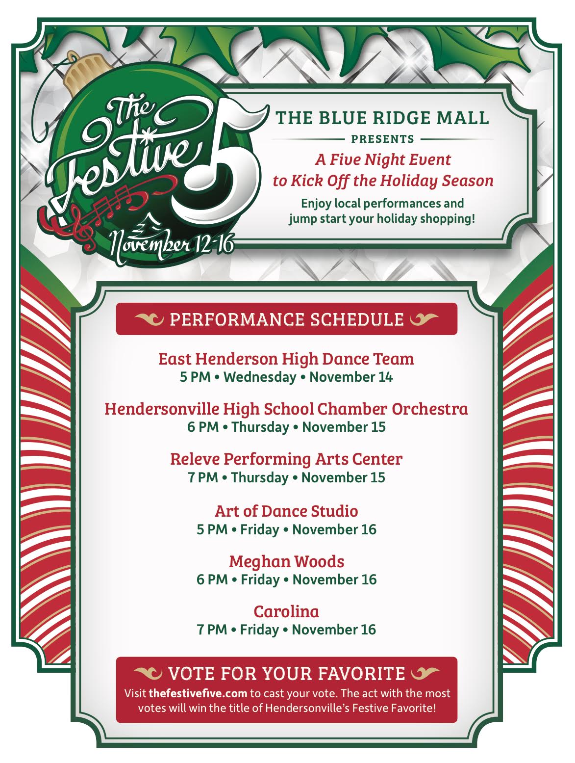 Be sure to come out this week, watch the performances and visit www.thefestivefive.com to vote on your favorite!